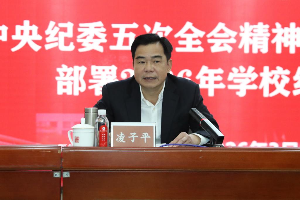 学校党委副书记、纪委书记凌子平在会上传达了二十届中央纪委五次全会精神、十三届省纪委五次全会精神,并部署了2026年学校纪检监察工作。他强调,要更加注重精准发力,谋深做实政治监督;要更加注重一体推进,持续净化校园政治生态;要更加注重常态长效,巩固拓展深入贯彻中央八项规定精神学习教育成果;要更加注重系统施治,持续深化群众身边不正之风和腐败问题集中整治;要更加注重科技赋能,提升监督穿透力和精准性;要更加注重“三化”建设,努力锻造“四个过硬”纪检监察铁军。